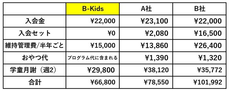 B Kidsではそういった別途費用を頂かないように広告宣伝費やランニングコストを抑えてご家庭の負担にならない料金設定を心がけております。