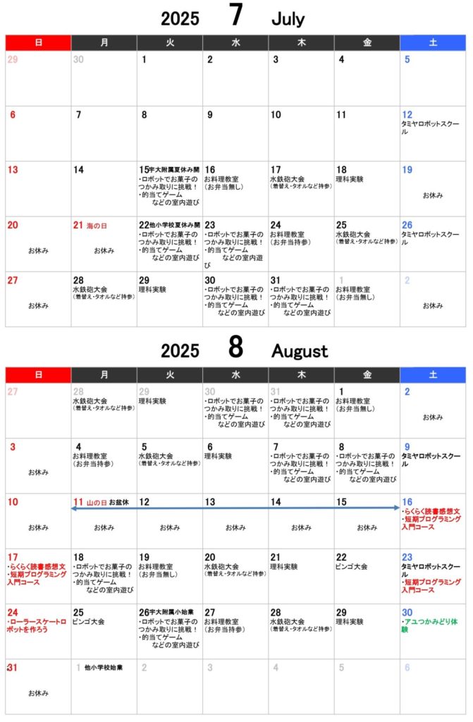 以下は7月・8月のイベントなどの日程になります。